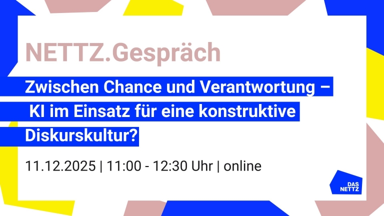 Das NETTZ – Vernetzungsstelle gegen Hate Speech wurde 2017 gegründet, um dem entschieden entgegenzutreten. Wir fördern digitale Zivilcourage und setzen uns für eine konstruktive Diskurskultur im Netz ein. Unsere Veranstaltungen sind Orte für einen konstruktiven und respektvollen Dialog, für alle, die sich gegen Hass im Netz und Desinformation einsetzen. Uns ist bewusst, dass es keinen diskriminierungsfreien Raum gibt, aber damit unser Zusammenkommen so sicher und wertschätzend wie möglich ist, gelten folgende Regeln: